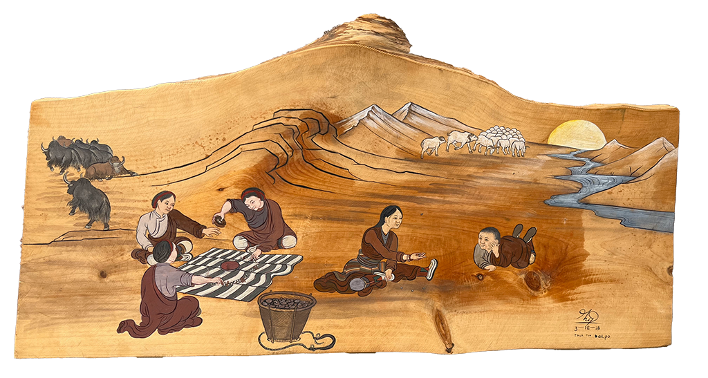 Shepherds rest on open grass, their flocks nearby. They play simple traditional games, marked in dust or wood. Laughter and movement break the quiet land. The scene shows ease, tradition, and shared time. 25*13.5inches