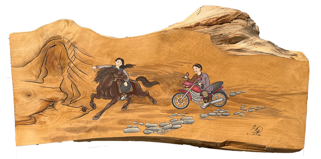 A woman on horseback and a man on a bicycle travel along a high Himalayan trail, their figures set against quiet peaks and open sky. A simple moment of movement, balance, and mountain calm.